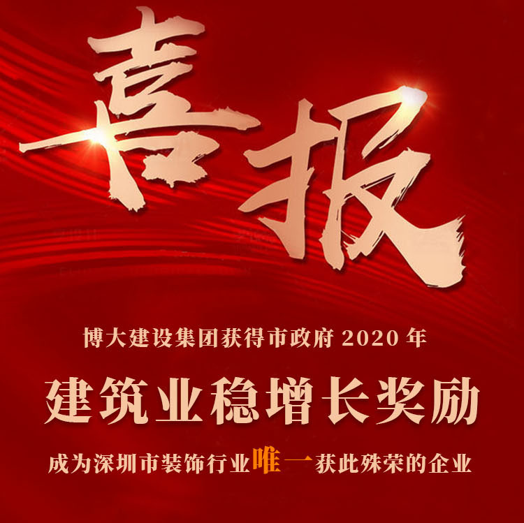 博大建設(shè)集團(tuán)榮獲深圳市政府2020年建筑業(yè)穩(wěn)增長獎勵,博大是獲此殊榮的唯一一家裝飾企業(yè),當(dāng)之無愧成為深圳市的行業(yè)龍頭,為行業(yè)爭光。